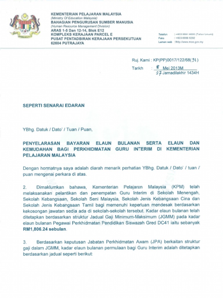 Penyelarasan Bayaran Elaun Bulanan Serta Elaun Dan Kemudahan Bagi Perkhidmatan Guru Interim Di Kpm