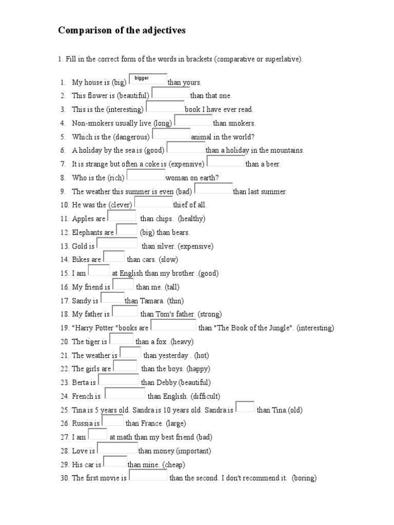 Exercise On Comparison Of Adjectives Exercise On Comparison Of Adjectives Fill In The Correct Form Of The Words In Brackets Comparative Or Superlative Course Hero