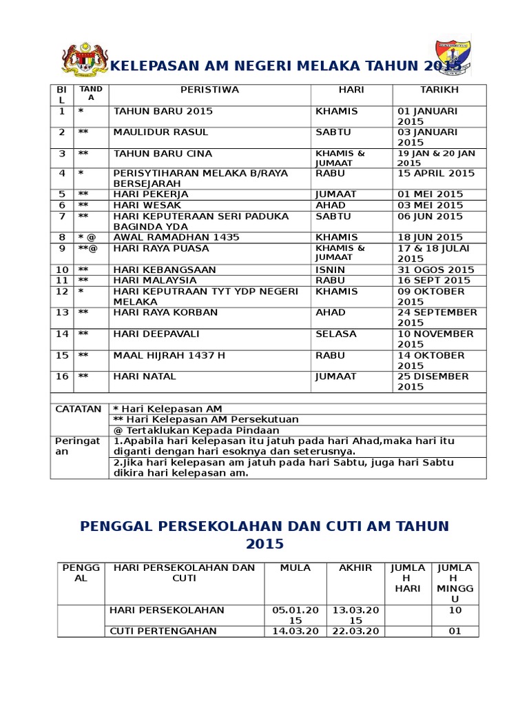 Hari Kelepasan Am Negeri Melaka Tahun 2015 Tand A