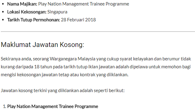 Iklan Jawatan Kosong Di Malaysia Play Nation Management Trainee Programme Lokasi Singapura Gaji Sehingga Rm6500 28 February 2018