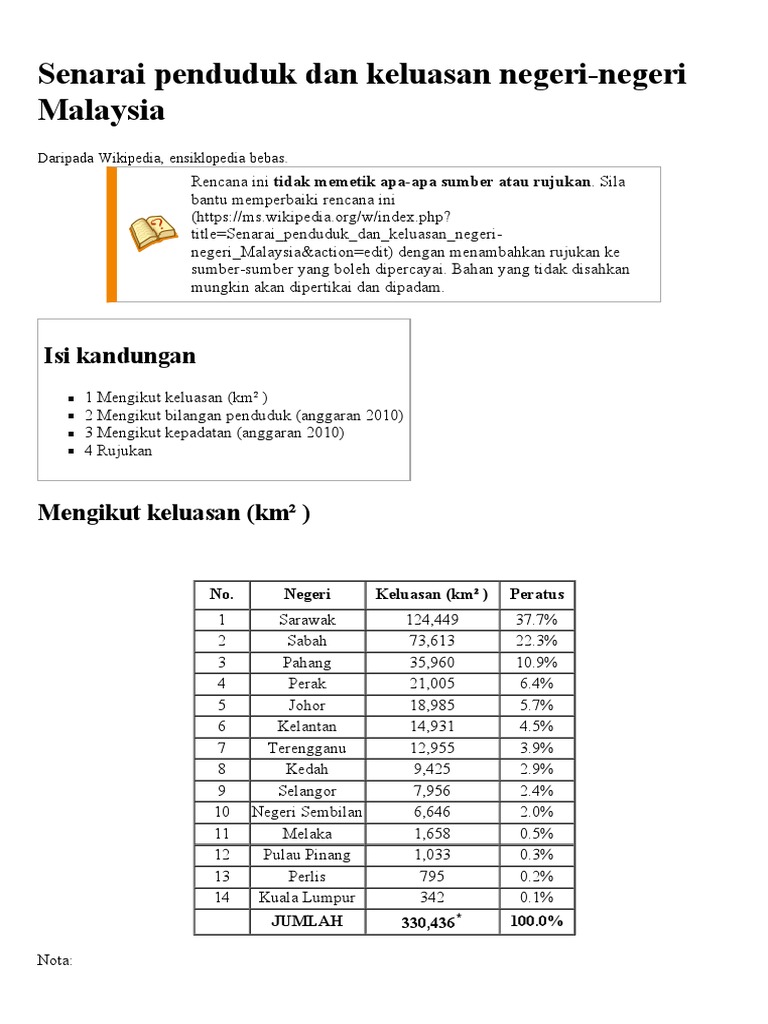Senarai Penduduk Dan Keluasan Negeri Negeri Malaysia Wikipedia Bahasa Melayu Ensiklopedia Bebas