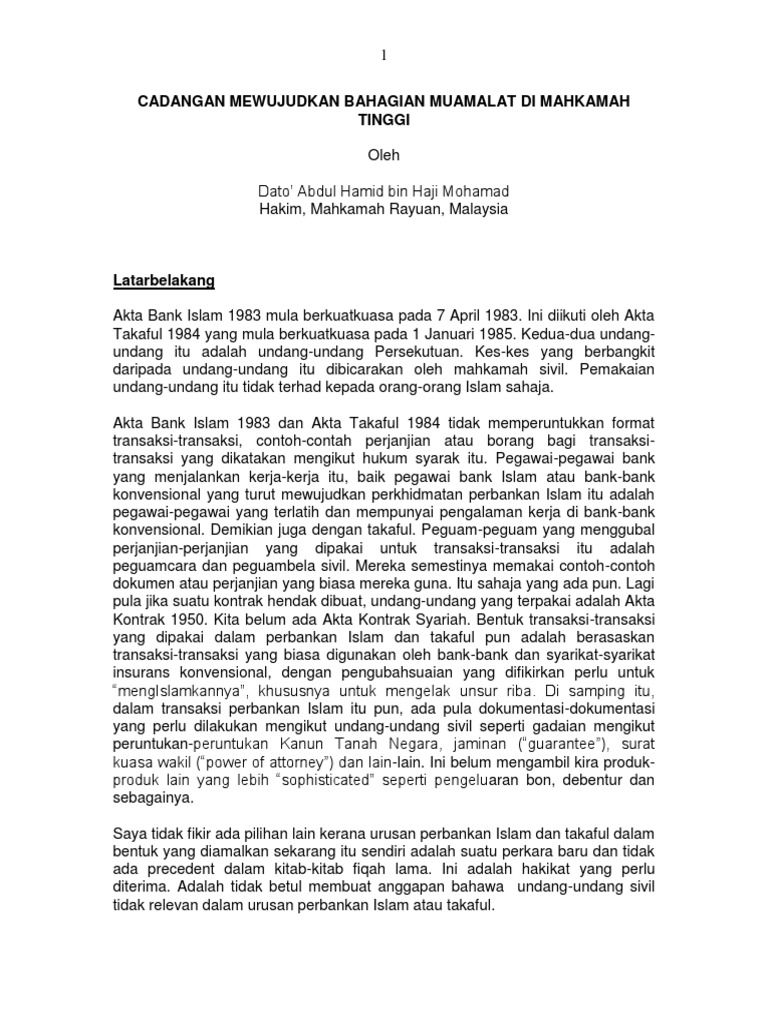 Cadangan Mewujudkan Bahagian Muamalat Di Mahkamah Tinggi